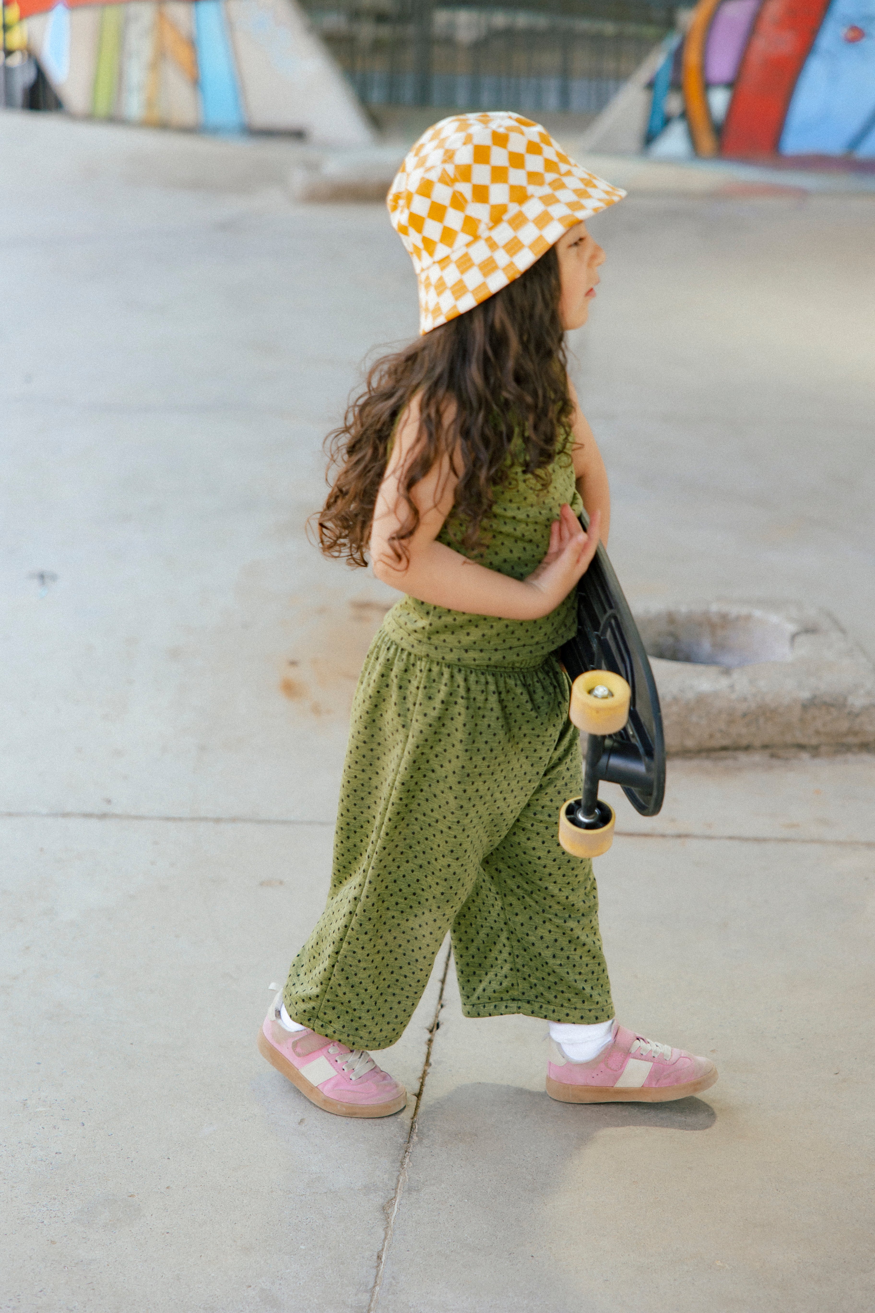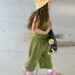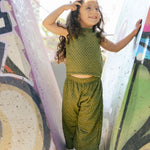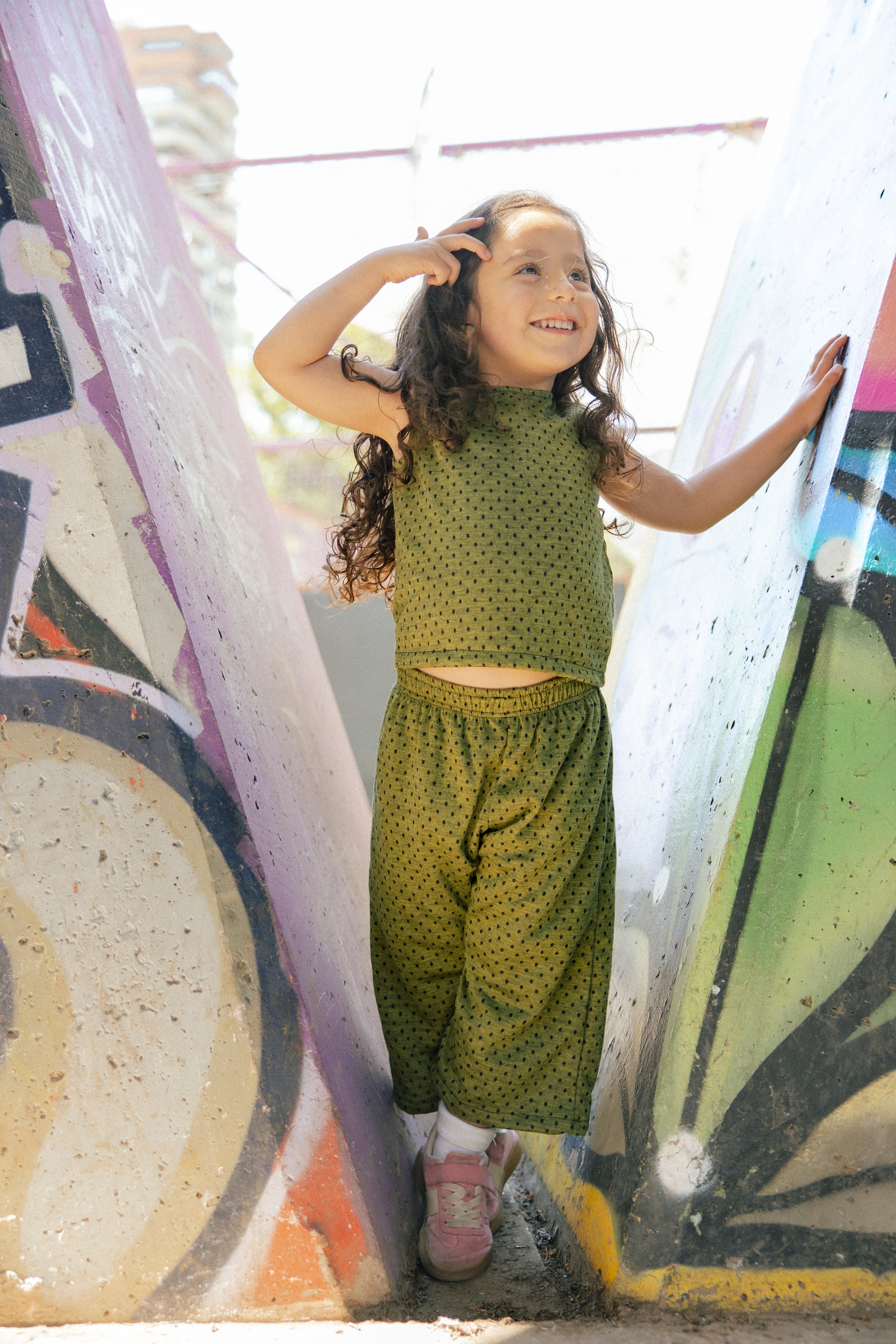 Pantalón holgado de algodon verde con puntos negros con cintura elasticada .